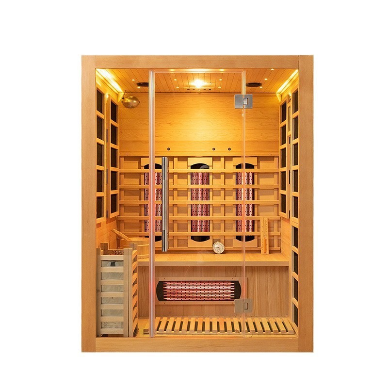 A sauna infravermelha e a vapor de madeira para 1 a 3 pessoas está repleta de recursos avançados para aprimorar sua jornada de bem-estar: Aquecedores infravermelhos e placas de aquecimento de grafeno infravermelho distante (fornecem aquecimento uniforme e eficiente para um suor profundo e relaxante); Ionizador de Oxigénio (purifica o ar no interior da sauna, criando uma atmosfera fresca e revigorante); Reading Light & Speaker (permite ler ou ouvir música enquanto desfruta da sua sessão de sauna); Painel de controle (permite fácil ajuste de temperatura, tempo e outras configurações para uma experiência personalizada); Fogão de sauna e tubo de onda de luz (trabalham juntos para gerar vapor e calor infravermelho, atendendo aos amantes de sauna a vapor e infravermelho distante).