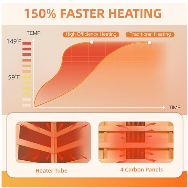 【Tecnologia de aquecimento eficiente】 Equipada com 4 painéis de carbono e 1 tubo de carbono, nossa sauna infravermelha de 1 pessoa fornece aquecimento surround em 360 graus, garantindo a distribuição de calor uniforme. Normalmente, ele aquece em apenas 10 a 15 minutos, permitindo que você aproveite sua experiência de sauna sem demora.