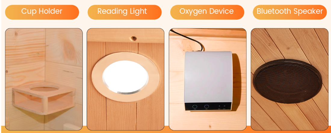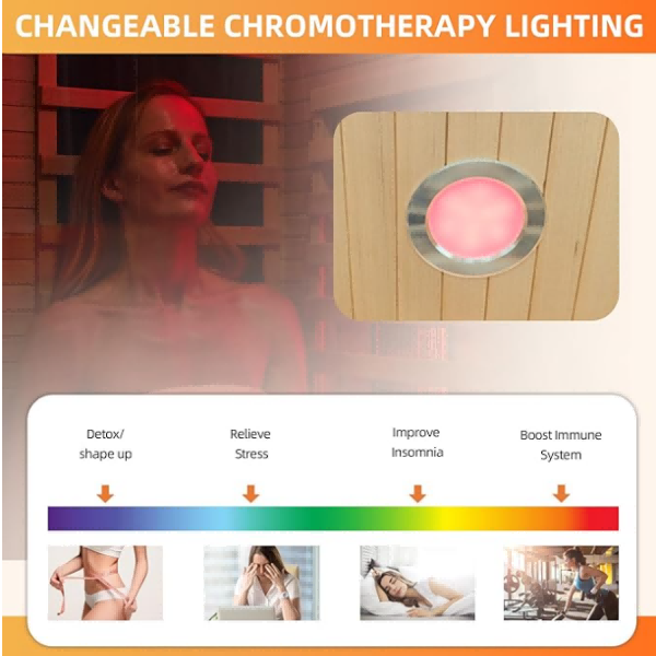 Relax Relaxamento aprimorado】 Nossas saunas infravermelhas para casa possuem um teto iluminado com 7 terapia de luz colorida, criando uma atmosfera imersiva para aprimorar sua experiência geral. É facilmente instalável em seu porão, banheiro ou academia, e com conectividade Bluetooth e uma barra de oxigênio, você pode desfrutar de uma sessão relaxante de sauna