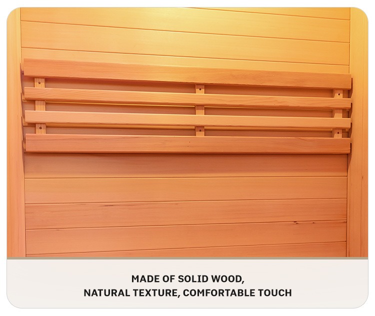 Duas madeiras canadenses premium, Hemlock e Red Cedar, são selecionadas. A madeira é dura e durável, com textura natural clara e cor uniformemente elegante. As propriedades naturais de cada pedaço de madeira conferem à sauna uma textura única, injetando genes estéticos naturais e de alta qualidade no espaço de bem-estar de sua casa.Sauna infravermelha interna para casa.