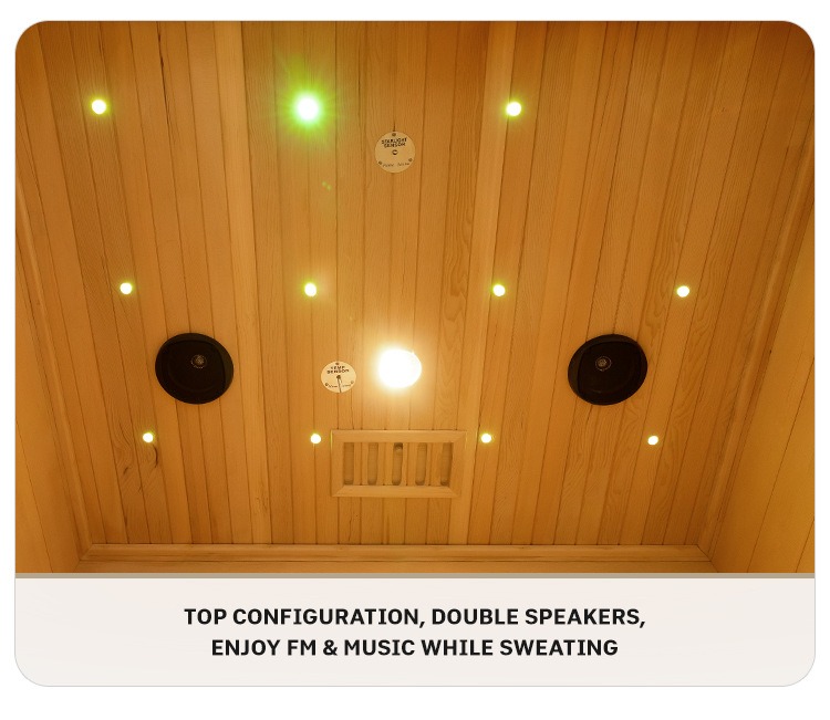 Um sistema de alto-falantes duplos está configurado na parte superior, suportando rádio FM e reprodução de música. Você pode curtir suas melodias ou programas de rádio favoritos enquanto sua, melhorando a experiência imersiva da sauna.
