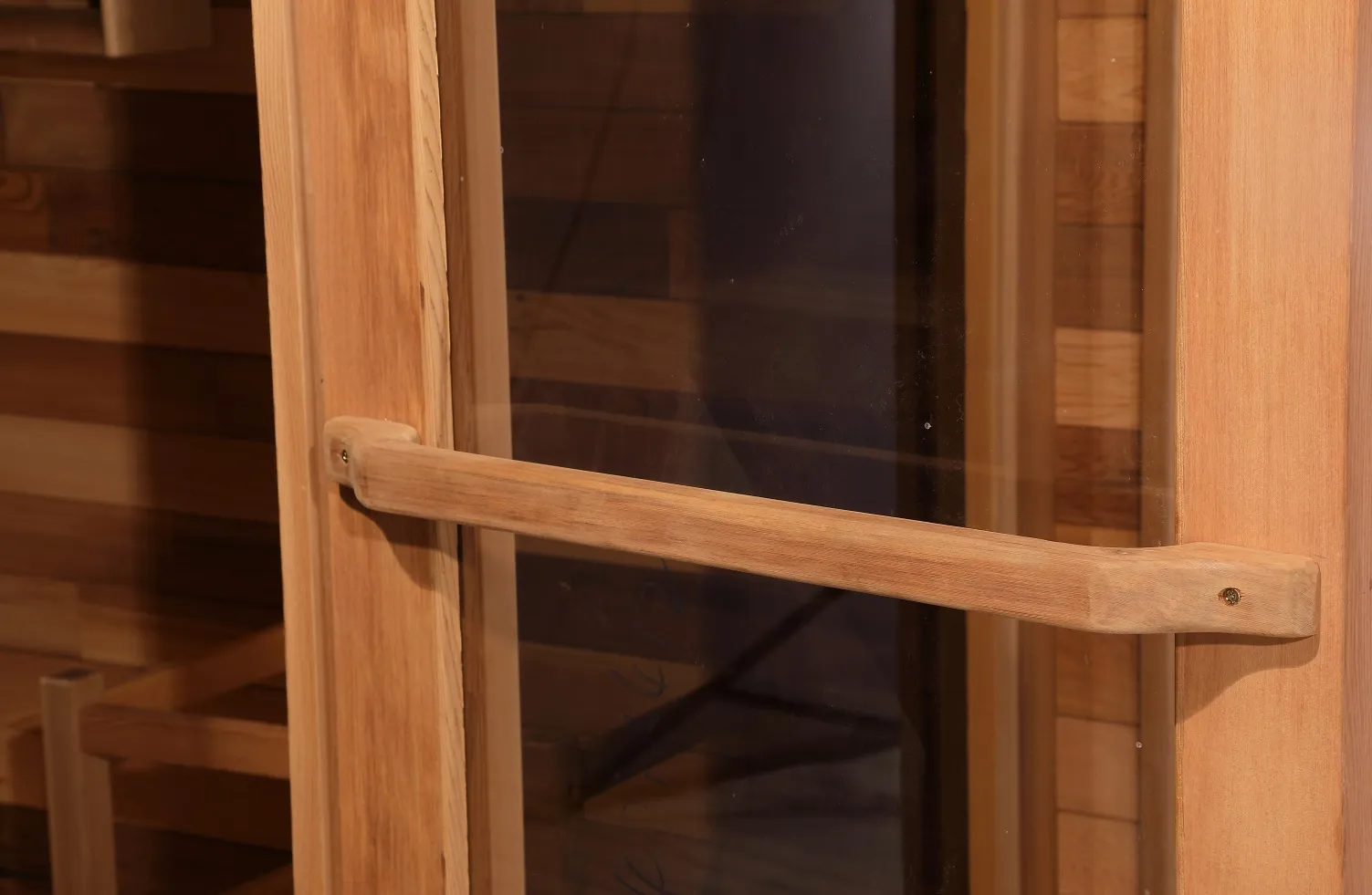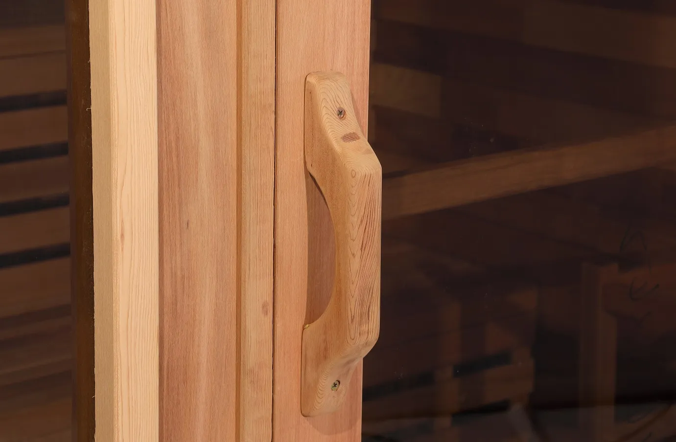 - Estética externa inspirada na floresta: adota uma cor natural de madeira com bordas curvas arredondadas para evitar colisões bruscas. Combinado com uma porta de vidro temperado de grande área, maximiza a transparência e oferece desempenho de segurança à prova de explosão. Integrando-se perfeitamente com cenas externas, como pátios e pátios, serve não apenas como espaço de sauna, mas também como destaque de sua paisagem externa.