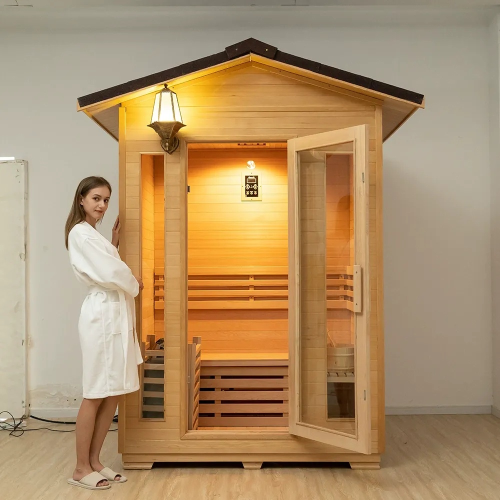 O tradicional sistema de aquecimento do fogão da sauna restaura a experiência clássica da sauna a vapor. Equipado com um sistema inteligente de controle de temperatura, pode ajustar com precisão a temperatura e a duração do vapor, garantindo que cada sauna atinja o estado ideal. O vapor é abundante e distribuído uniformemente, e o calor quente envolve todo o corpo, criando um ambiente de sauna confortável e agradável. O design da porta de vidro superior Fengshui é engenhoso, transparente e bonito, ao mesmo tempo que implica auspiciosidade. O candeeiro de parede retro (modelo exterior à prova de água) instalado ao lado da porta emite uma luz quente e suave quando iluminado à noite, e a lâmpada à prova de explosão de baixa tensão no interior garante uma utilização segura, mostrando cuidado em cada detalhe. A tensão suporta personalização global e, com um cabo adaptativo de alta potência, o uso de eletricidade externa é seguro e sem preocupações.
