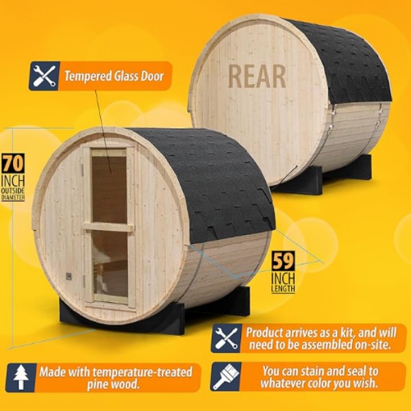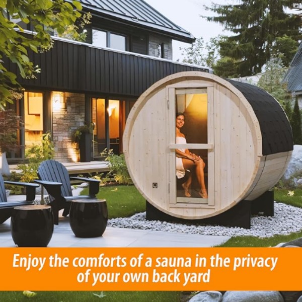 · ✅ [BARRIL PARA MELHOR CIRCULAÇÃO] o calor circula de volta ao longo das paredes curvas em vez de se acumular perto do topo, o que cria um fluxo constante de calor distribuído uniformemente por toda a sauna.