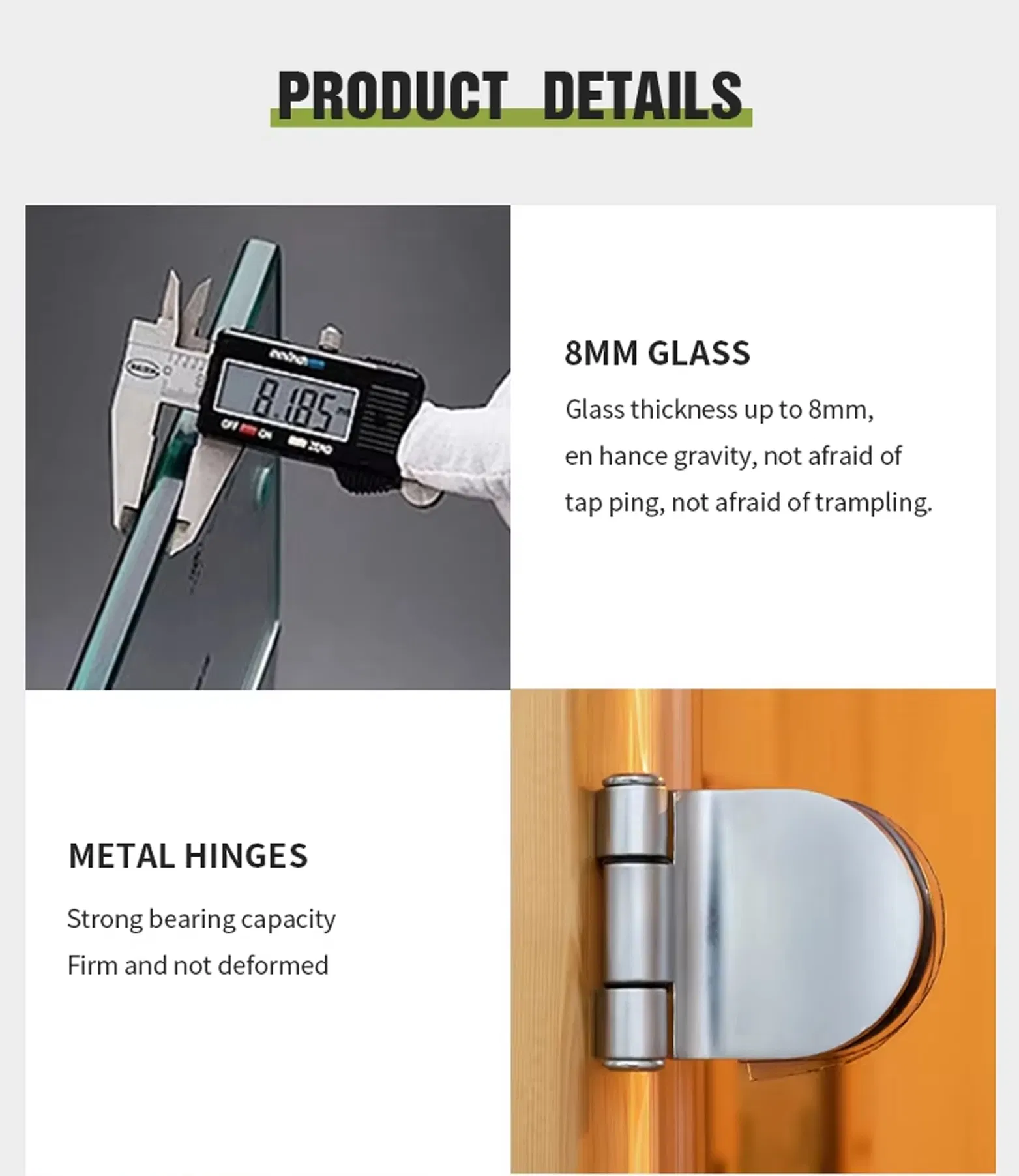 - Dobradiças de metal resistentes – Dobradiças de aço inoxidável com capacidade de carga de 100 kg, garantindo que sua porta permaneça alinhada por anos.